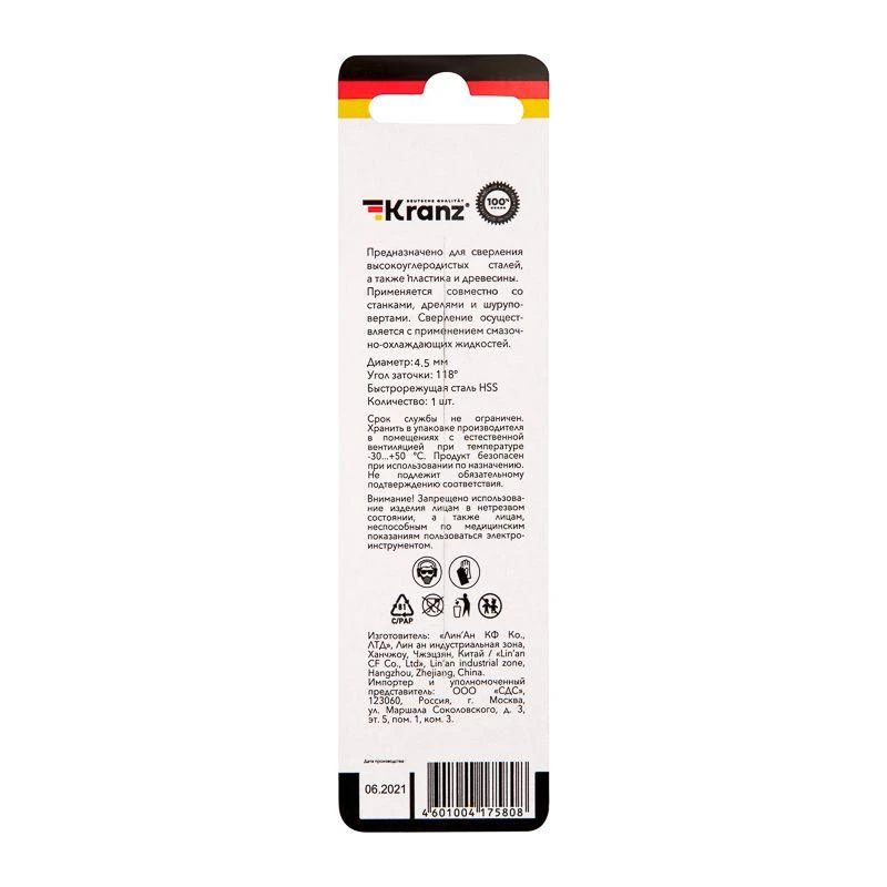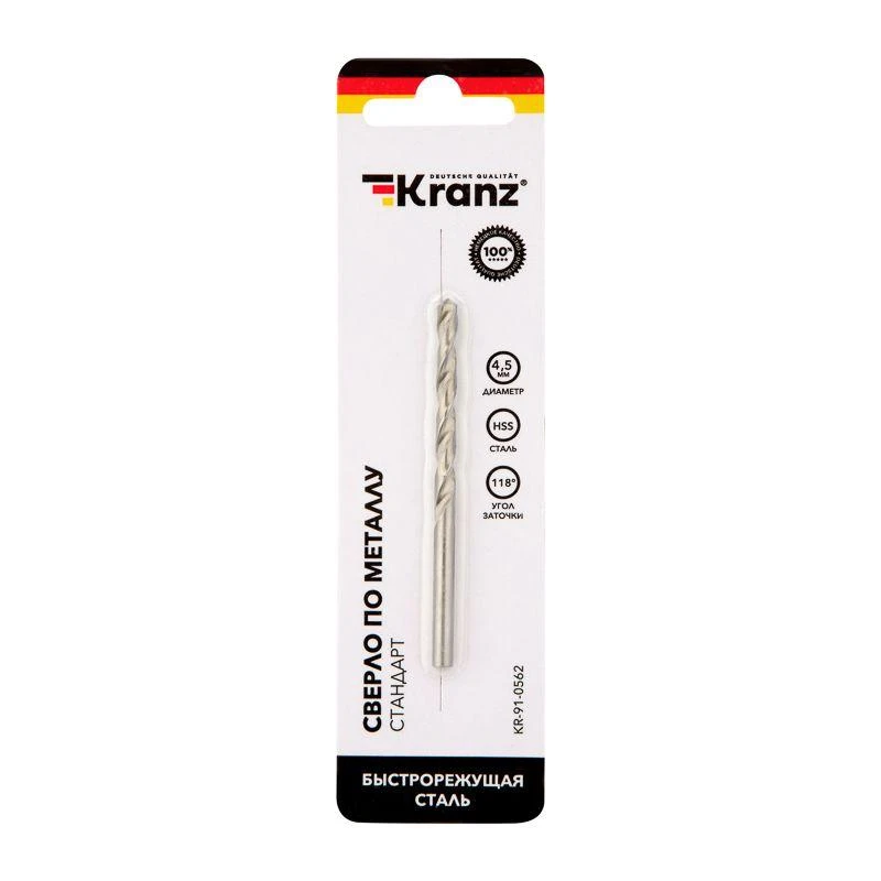Товар Сверло по металлу 4.5мм HSS DIN 338 (уп.1шт) Kranz KR-91-0562 доступен с доставкой по г. Москва, Московской области и территории РФ, или самовывозом.